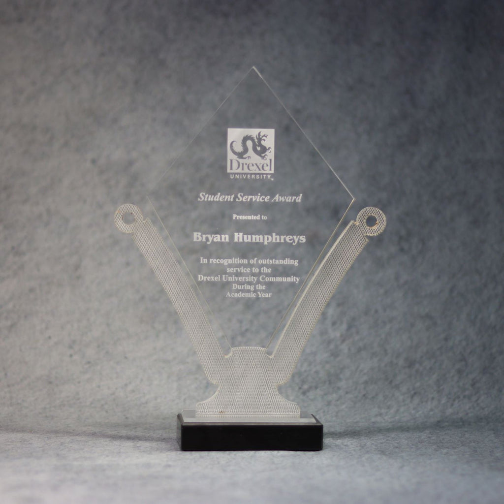 Clear acrylic diamond fitted by lasered struts and mounted on silver mirror and black marble base. This acrylic is elegant and perfect for your desk or credenza. Recognize your achievers with this distinctive award.