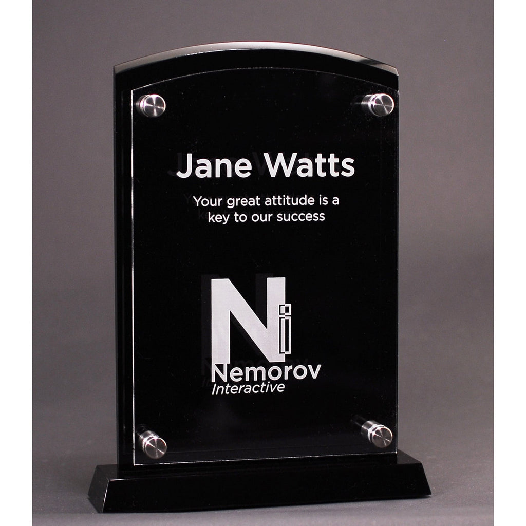This award has a clear acrylic panel offset with silver-toned hardware from a free-standing black ebony piano finish wood background creating impressive depth. Add custom text, images or logos to create a gift to honor employees, members of your organization or recognize donors to your cause. This item can be a great way to honor Employee of the Month. Create a wonderful wedding, birthday, or anniversary gift. Let us help you bring your vision to life! Available in two sizes.