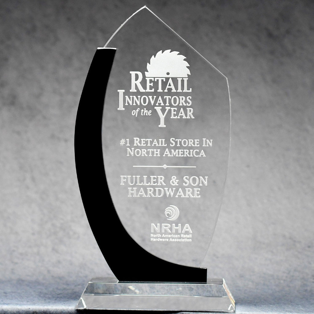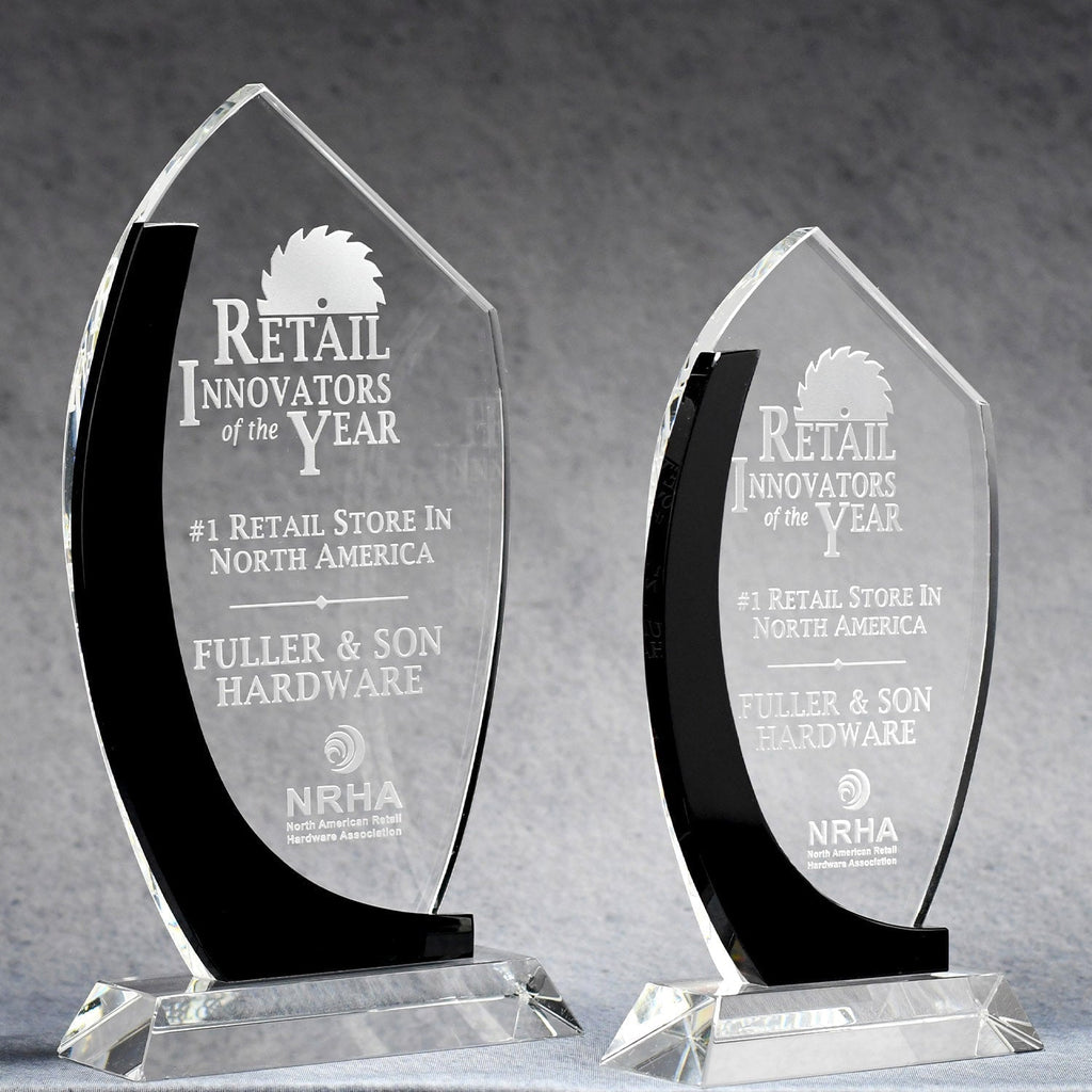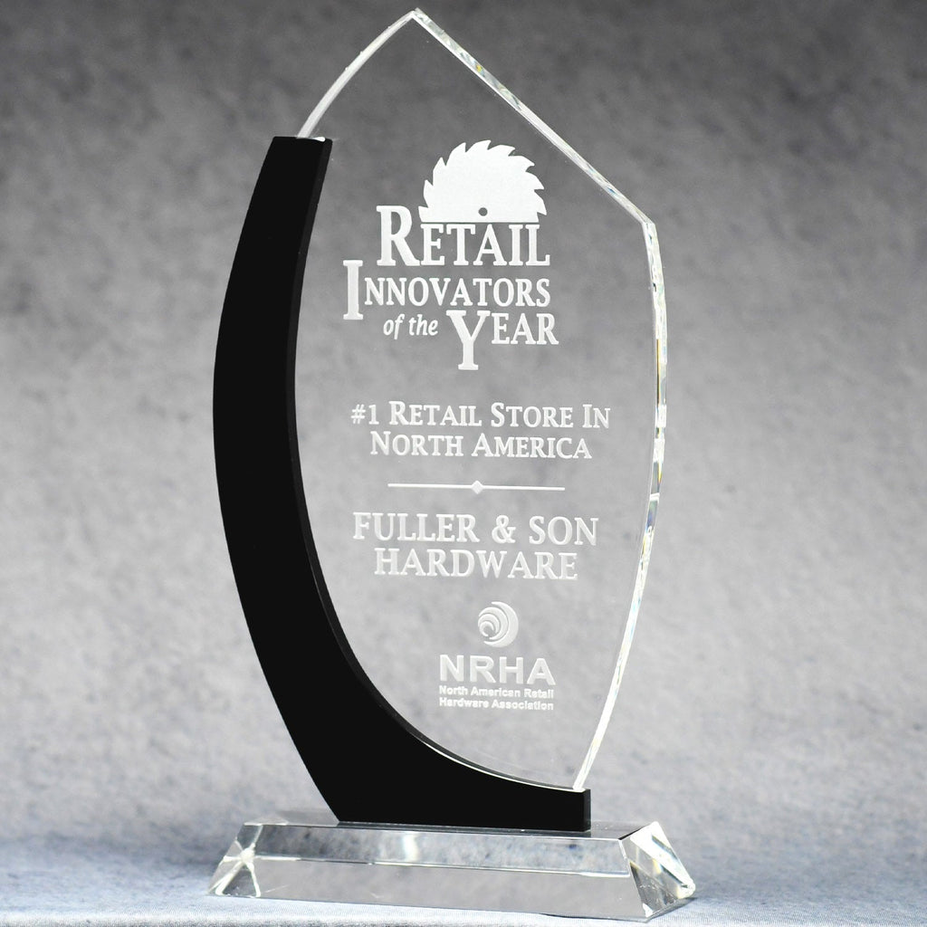 The sharp contrast between perfectly Clear Crystal and Ebony Glass gives a rich, contemporary feel to this high-class award with a gentle curve. Available in 2 sizes.