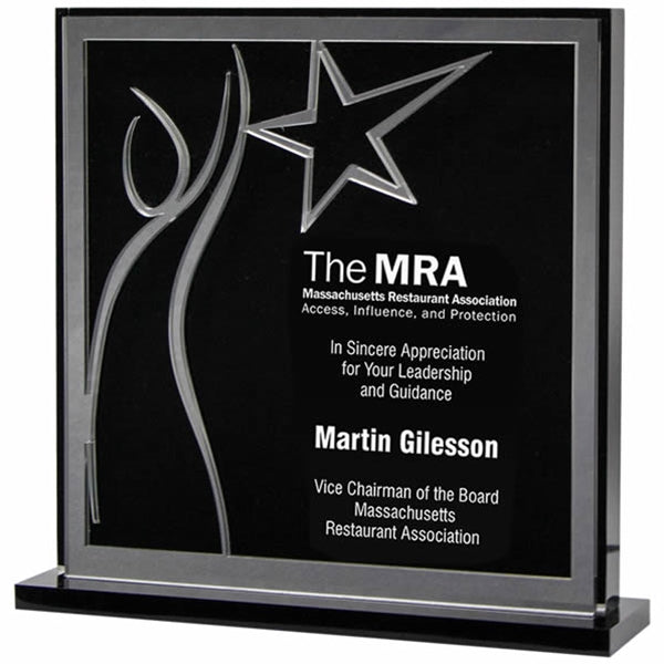 Thick, clear acrylic square accented by a star with black and gold contour mirror all the way to the bottom. Highlight your star achievers' accomplishments with this prestigious award.