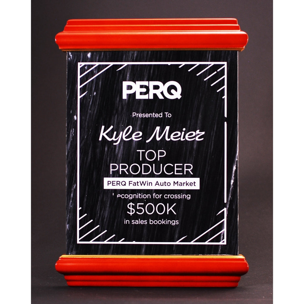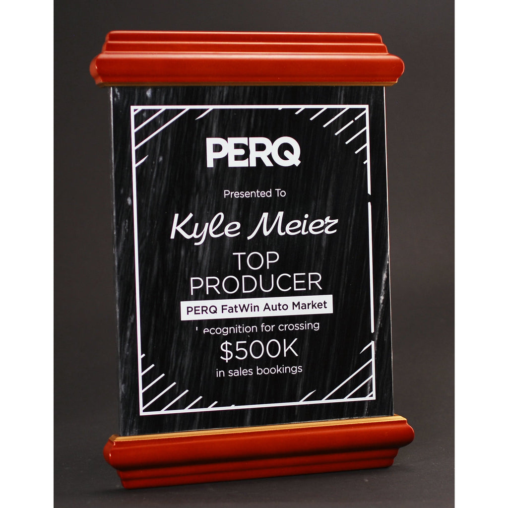 This sophisticated award features Mahogany Wood caps showcasing a rich Black Marble Panel for etching. With two available sizes, it is an innovative way to honor the Employee of the Month and Employee of the Year for your company. Add custom text to create the perfect presentation gift to recognize significant donations to an organization. Include your company logo to honor a lifetime of service. Let us help you bring your vision to life!