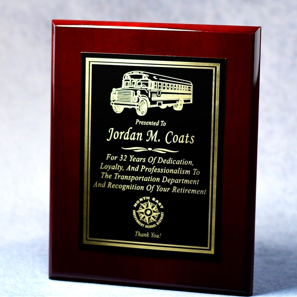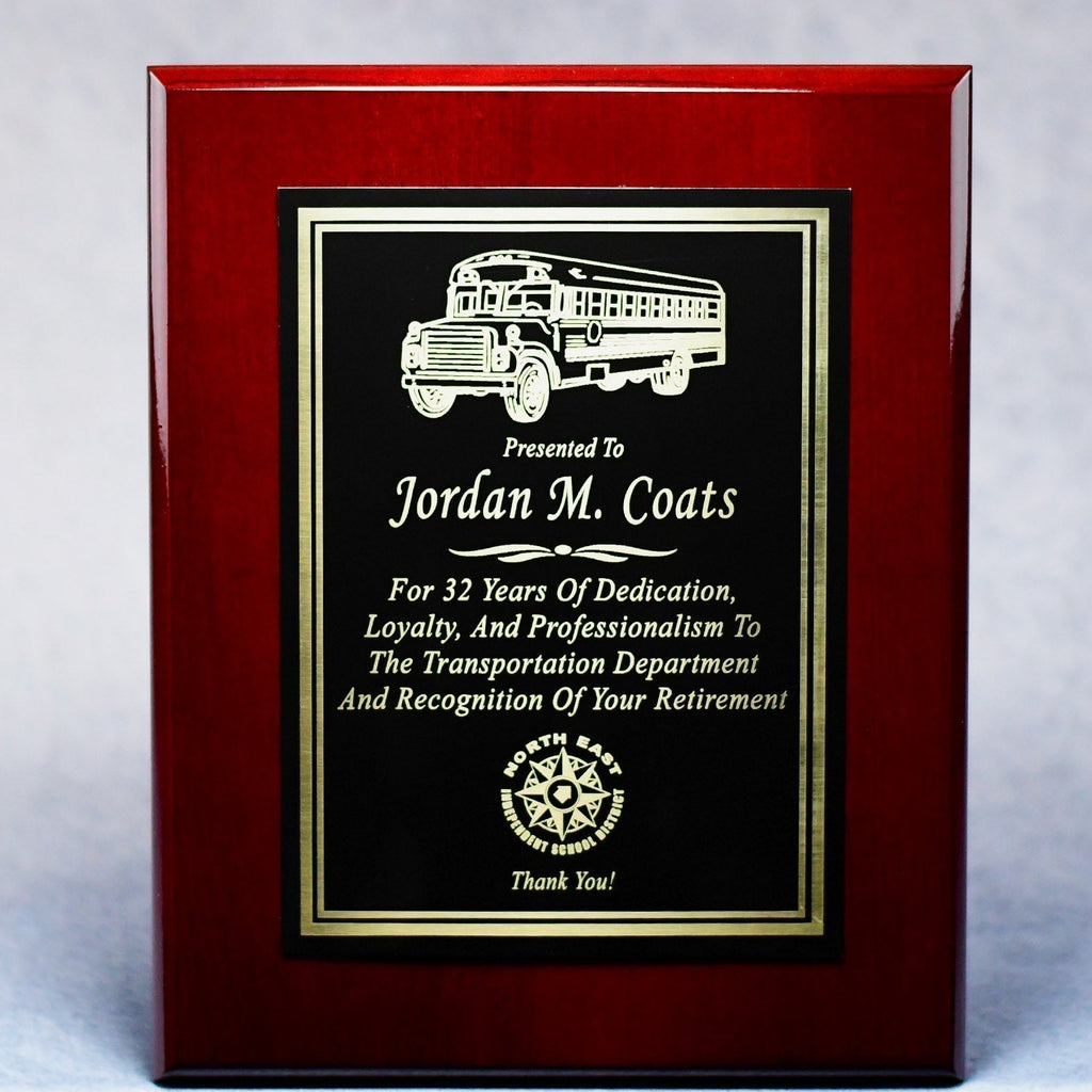 An elegant Rosewood Piano Finish Plaque with a lasered metal plate has a modern appearance that looks great in the office or lobby. A large imprint area can easily accommodate any logo and text.