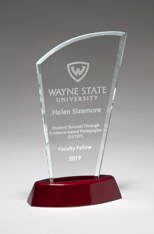 Sail series clear glass award high gloss rosewood finished base. 3/8" thick polished glass. Suitable for laser engraving, sand etching or digital printing. Individually gift boxed.